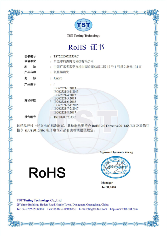 本證書為東莞鈞杰的氧化鋯陶瓷ROHS檢驗(yàn)報(bào)告,我公司采用的陶瓷材料均通過ROHS檢驗(yàn),安全可靠。